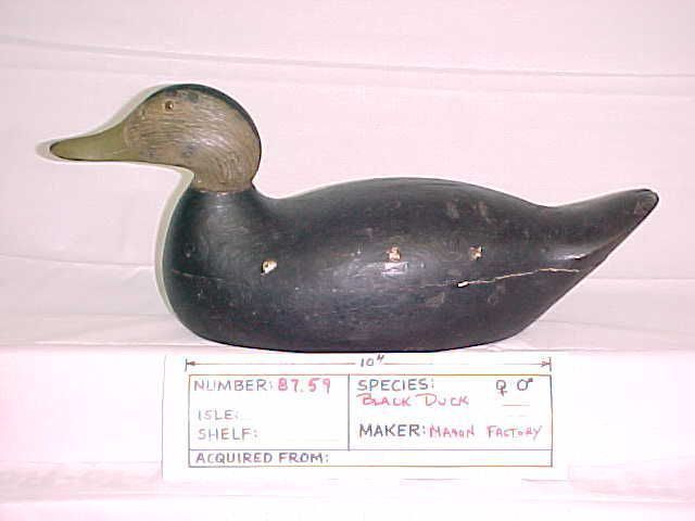 Black Duck - Mason, 2 piece hollow, repaint black duck over mallard, head on shelf, leather, scratch paint head, applied weight, one missing glass eye, nails starting to rust and putty showing, loose head, chip tailCollection