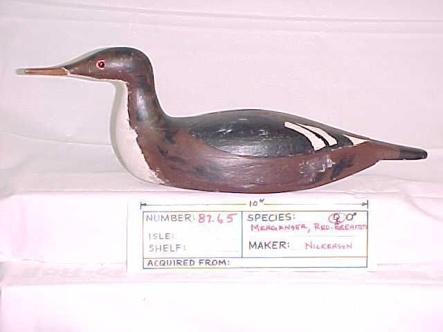 From Falmouth MA, not used much, glass eyes, 3 piece body with head on shelf, pad weight, screw eye, stamped 115, raised wing carving /in relief,stamped N, original paint.