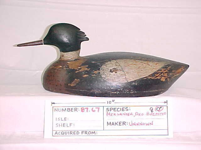 Plug bill, head on shelf, stamped eyes, 2 piece hollow with flat bottomboard, stamped 168, original paint. Large paint chips.