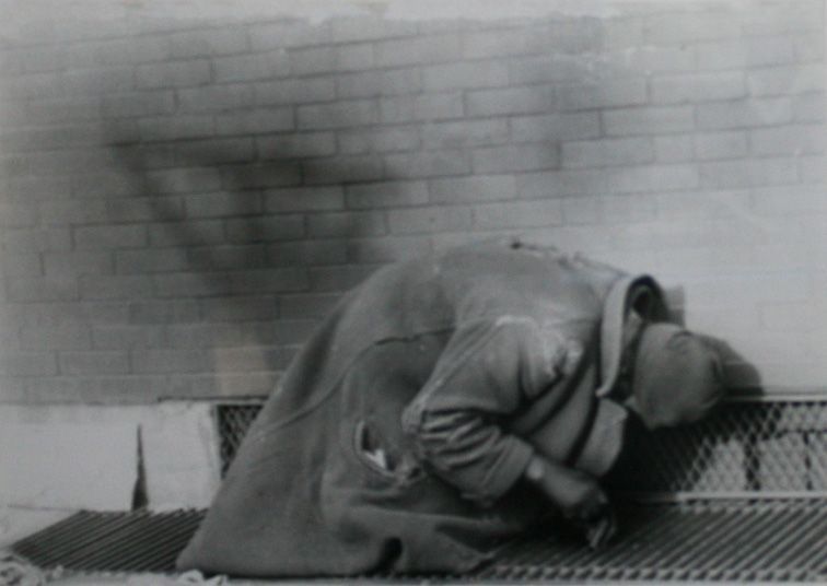 Black and white photograph of a man hunched over on the street