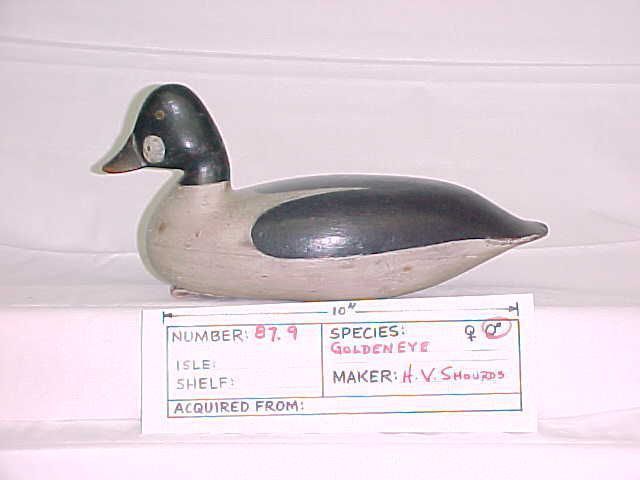 Two piece hollow body with something inside it, head on shelf, leather strap, original paint, stamped 1001D; written in pencil on bottom - Harry Shourd Tuckerton 1870- 1920; cracked neck; 6.25 x 13 x 5 in.