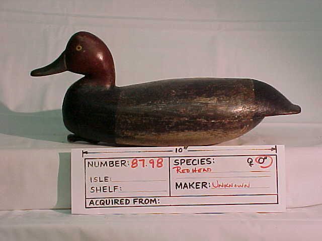 Stamped eyes and painted, 2 piece hollow, head on shelf, top half extends beyond bottom, weight missing, leather strap, labeled R10, 382 stamped N, R10, 382, rounded bottom, original paint