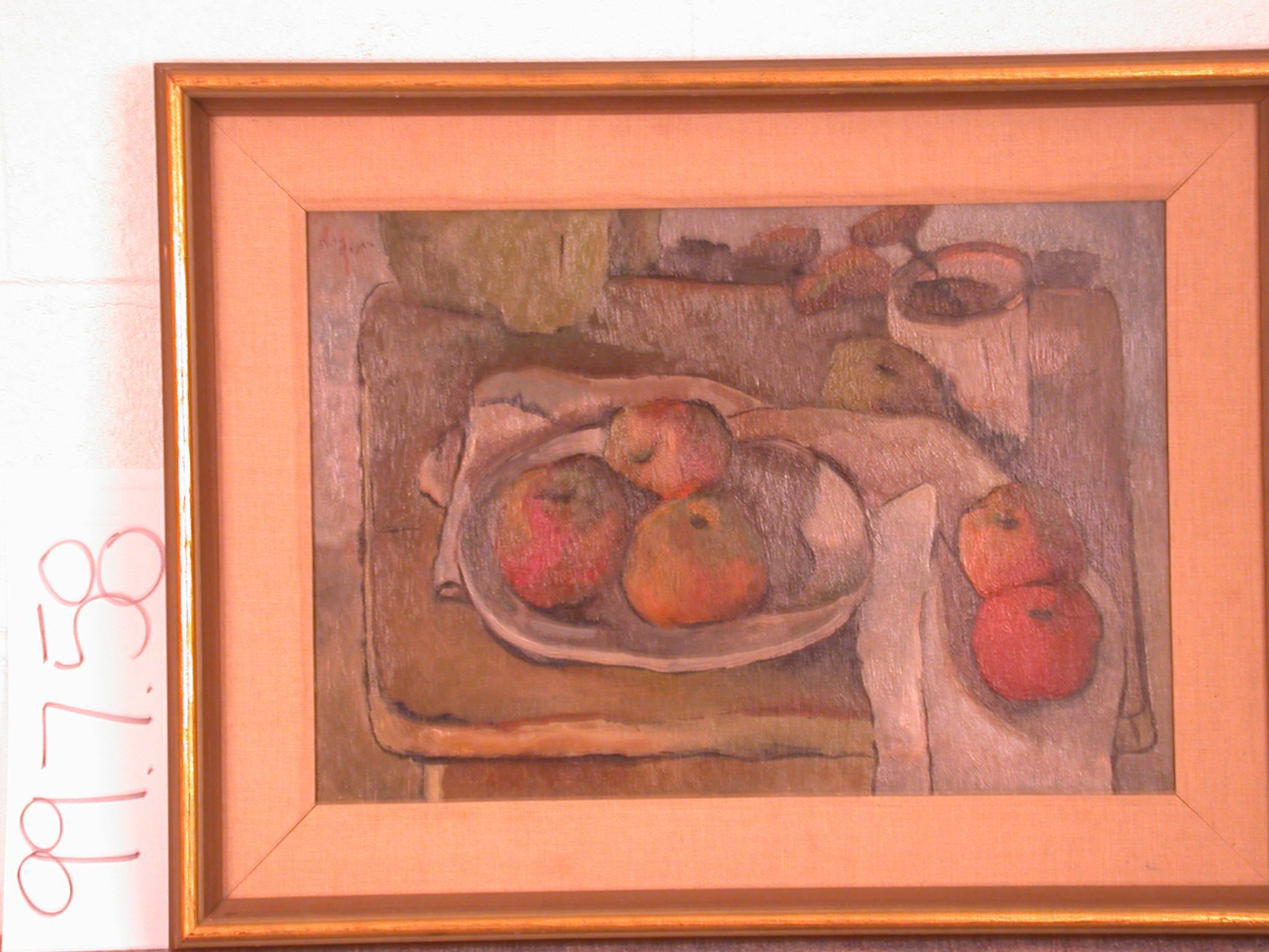 Framed realistic painting of still life with plate of three apples and two apples on the side.