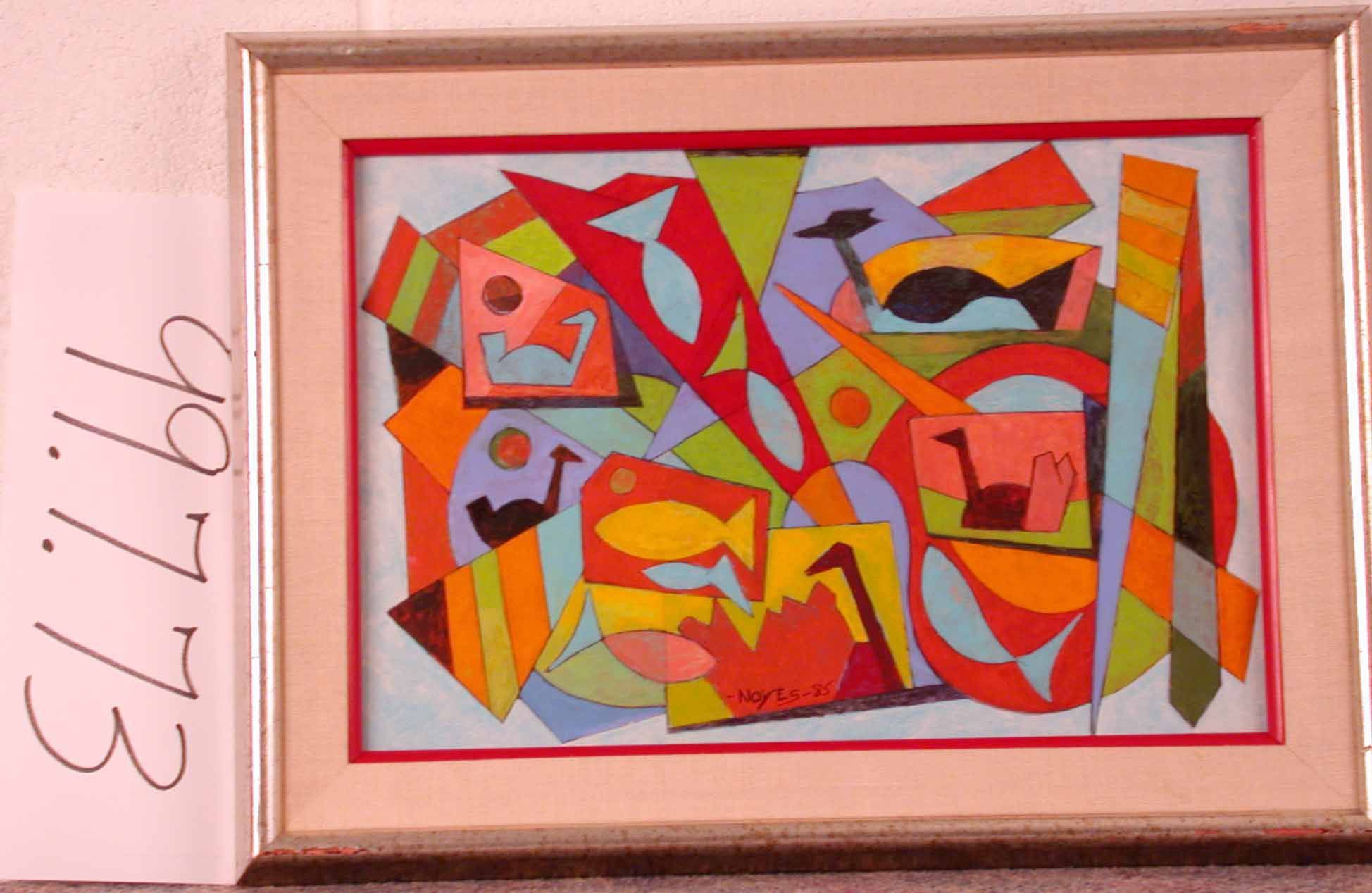 Framed painting of swans and fish in geometric shapes with light blue background.