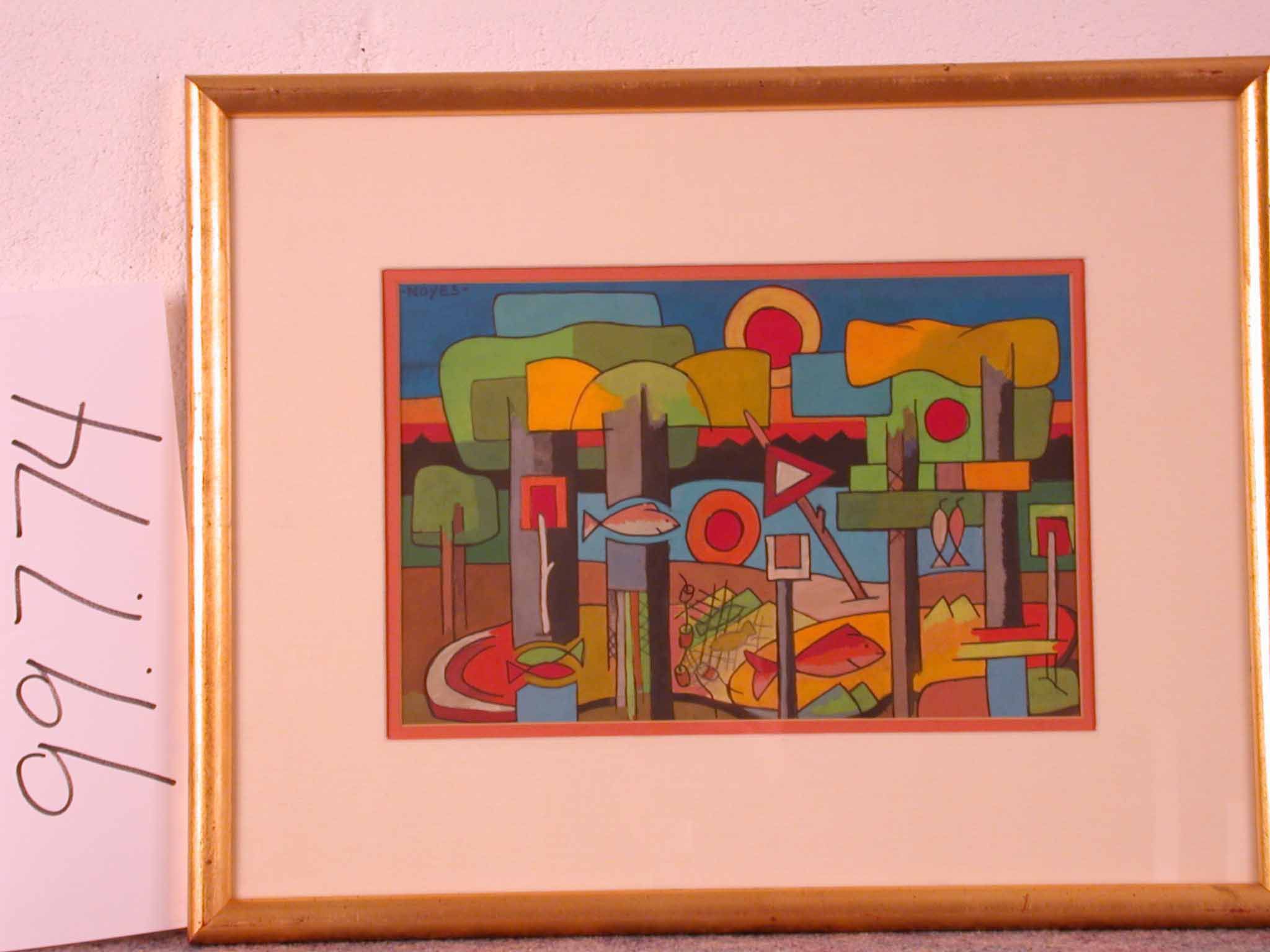 Framed painting of river markers, pilings, fish, nets and sun on horizon.