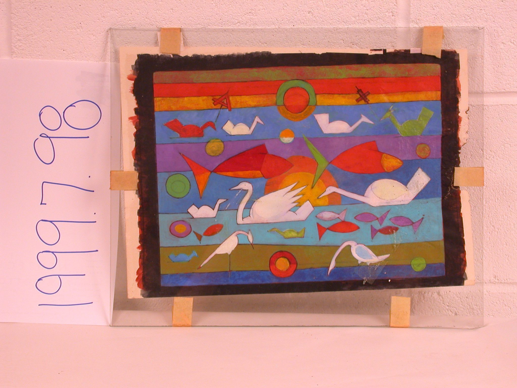 Acrylic painting between glass for protection. Red fish and swans in water.