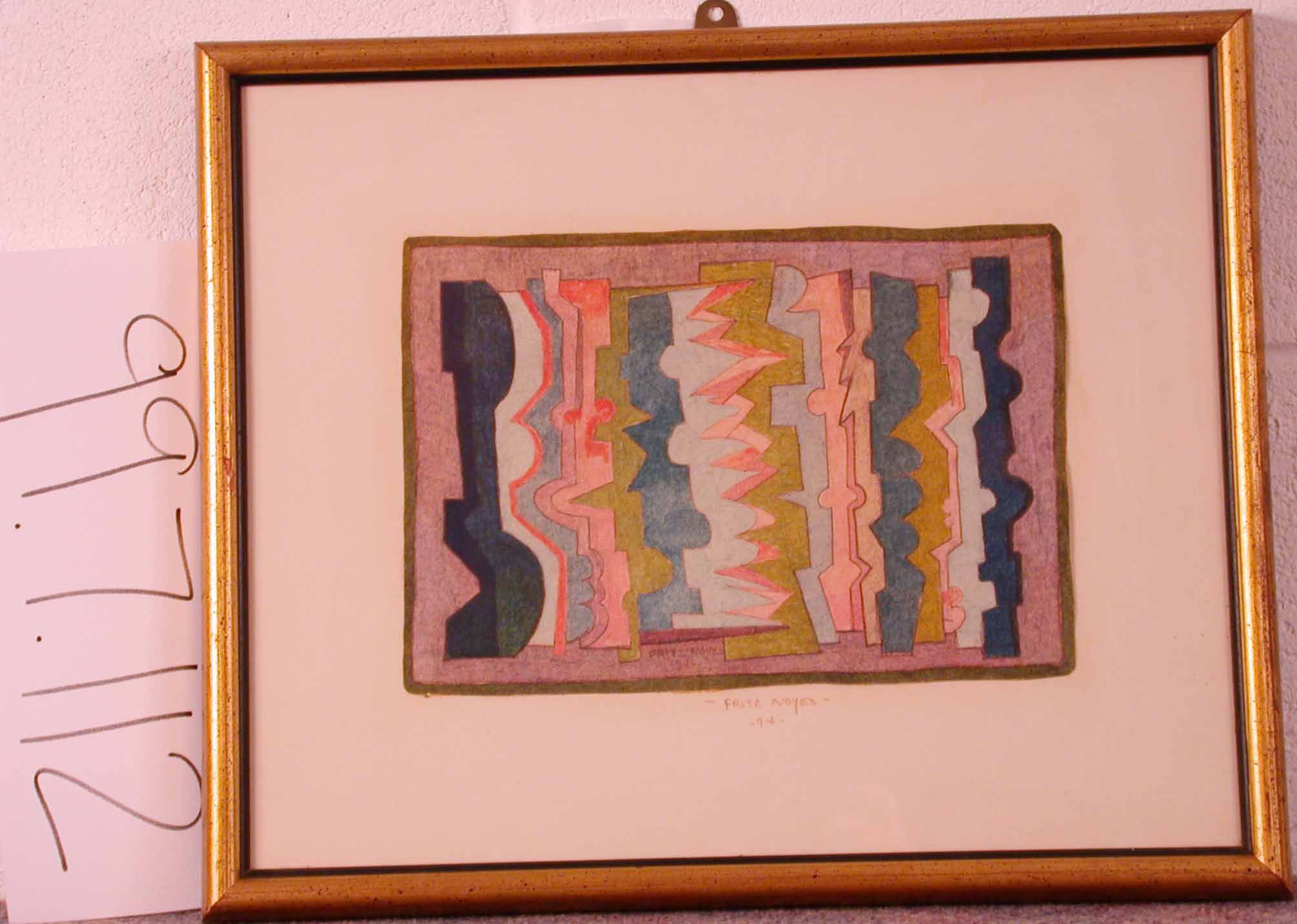 Framed drawing of pastel vertical zigzags on lilac background with green border.