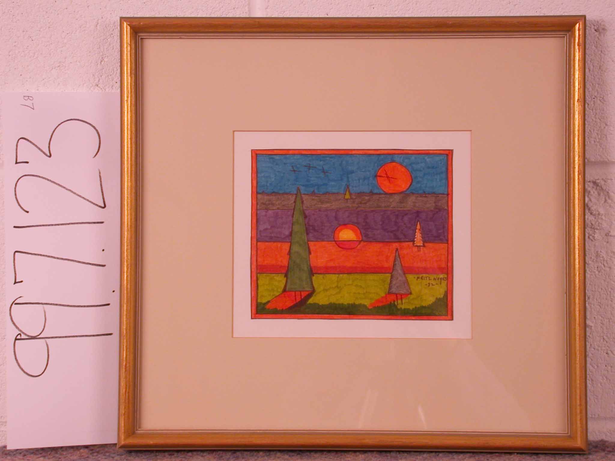 Framed drawing of sun setting over land with sun reclection in water and shadows cast by four triangular trees.