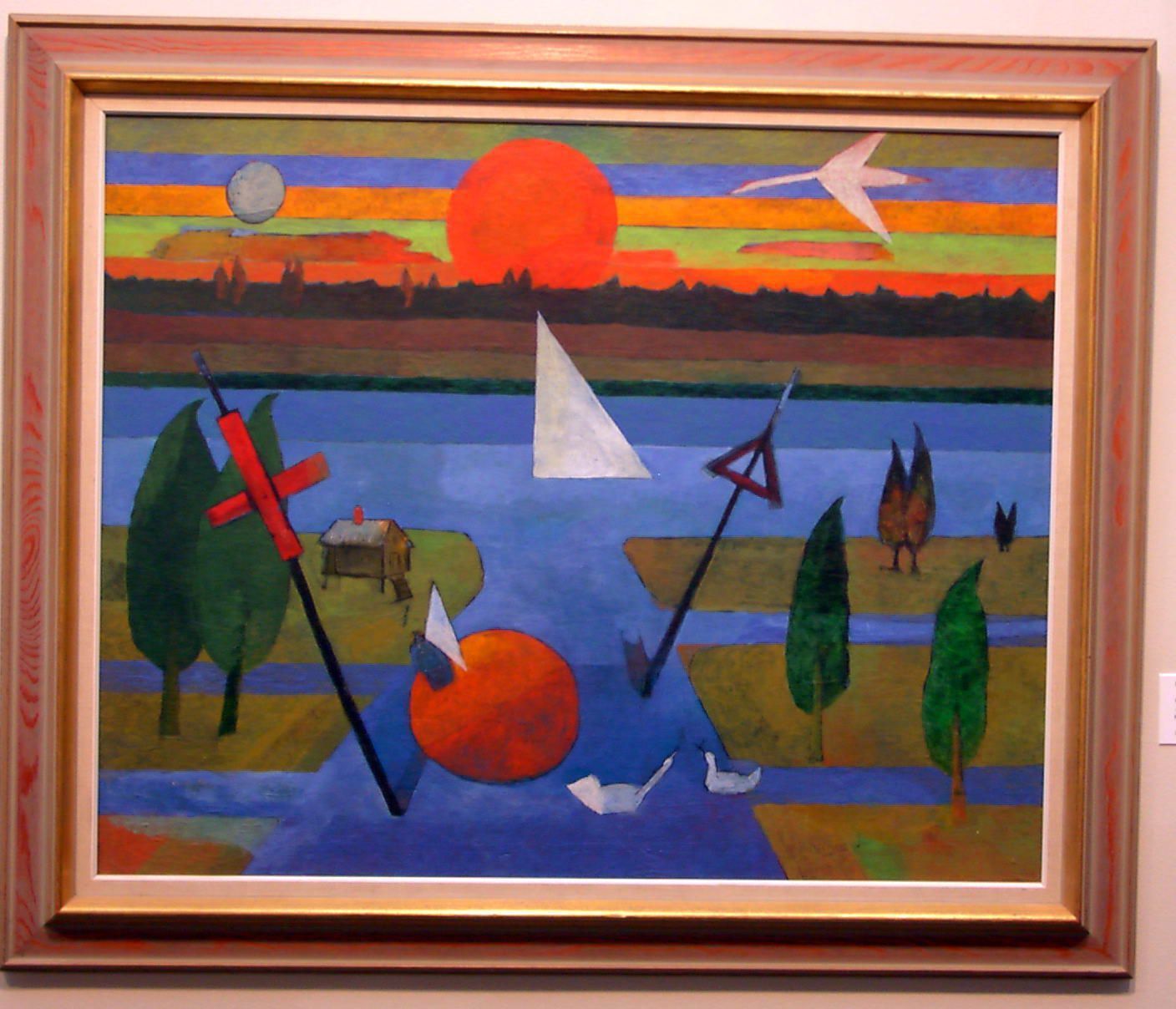 Channel Farm, Fred W. Noyes Jr. Framed painting of river with channel marker and farm on land. Btm right -Noyes