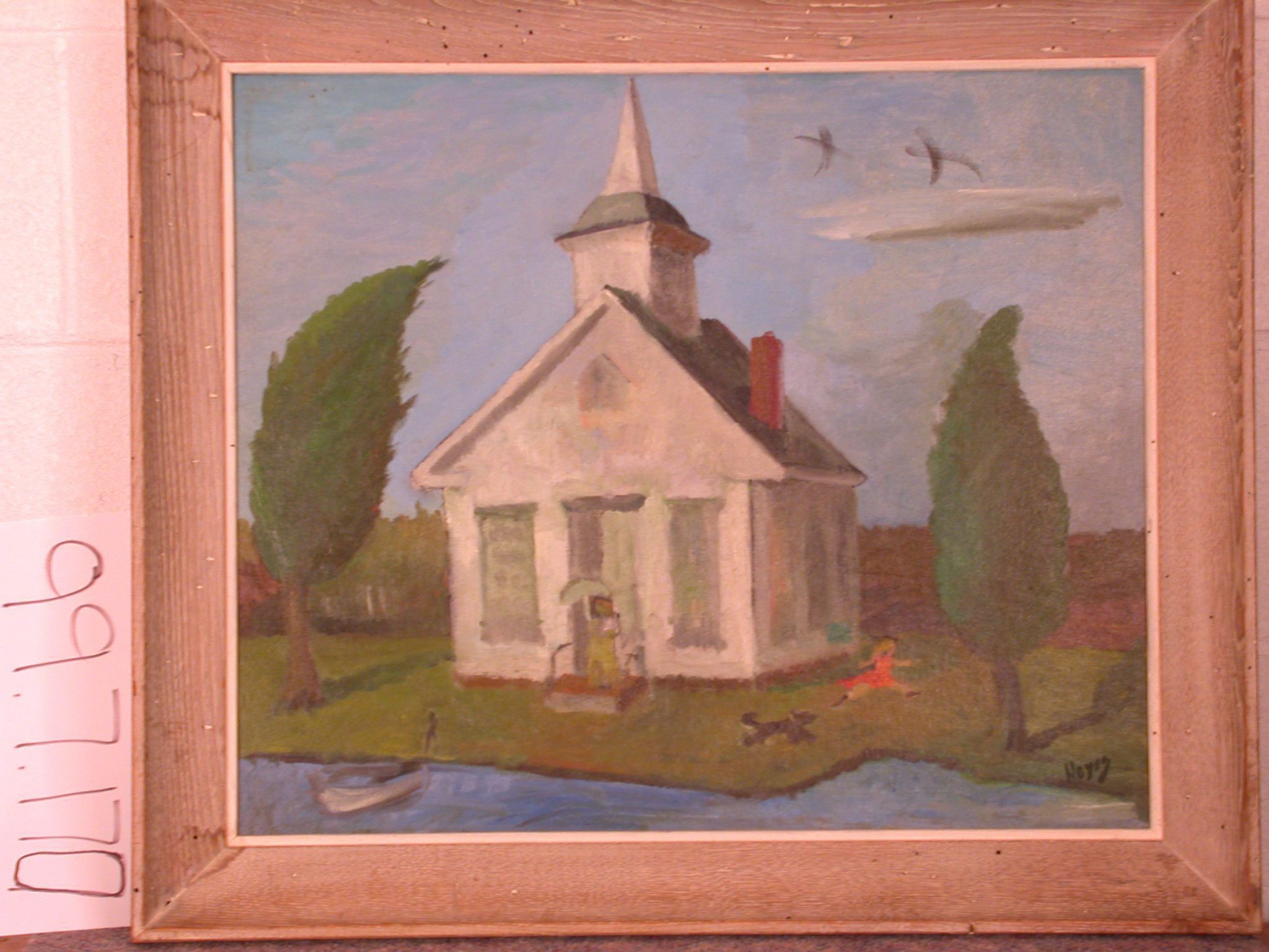 Framed painting of white chapel facing river with canoe on the water, child with dog on land, chapel framed by two cedars.