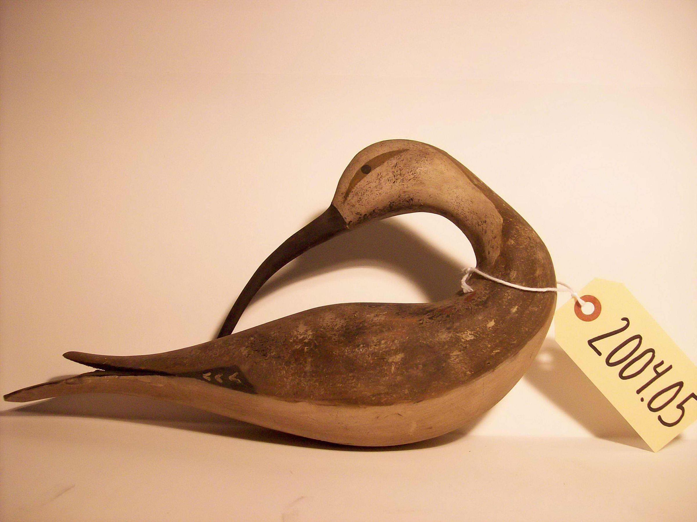 Tan wash on belly. Brown faded wash on top with sponged black and tan paint. Black beak, tail, and eyes. Twisted head connected to body. Dusty. "BIEBER" on bottom and dowel hole.Collection
