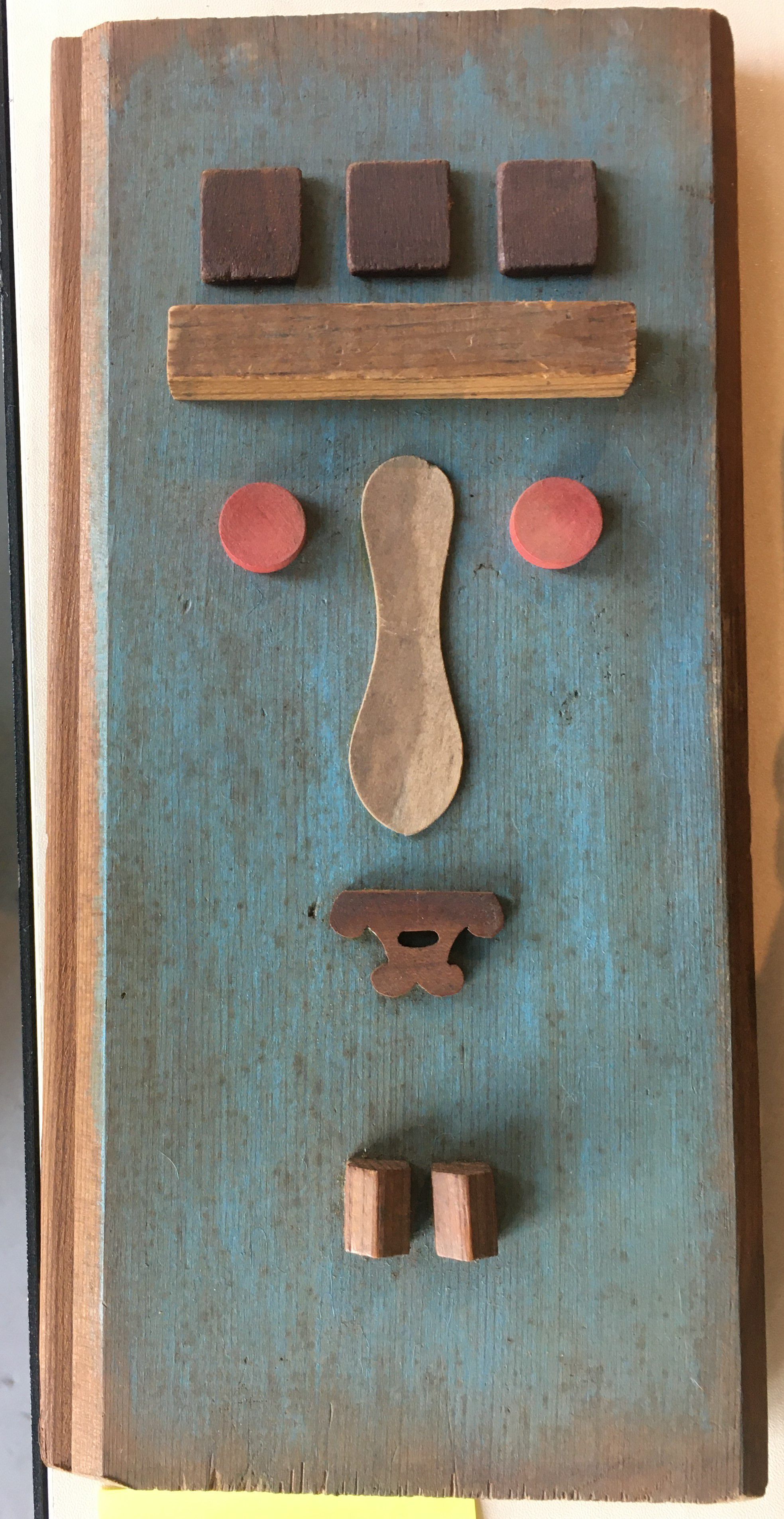 wooden floor plank with teal staining, wooden elements appear to make a face, red eyes, no mountCollection