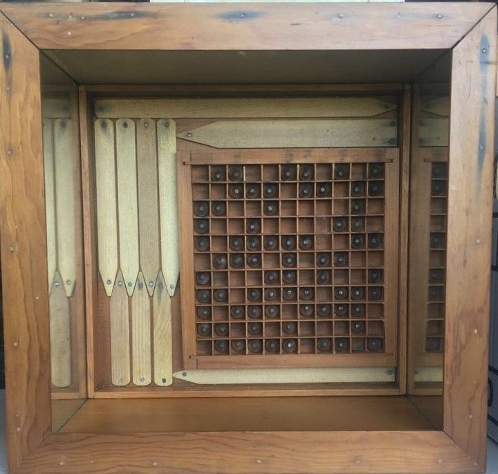 wooden enclosure, mirrors on inside sides, wooden stakes (10), wooden balls (halves) in grid, wooden stakes to left/top/bottomCollection