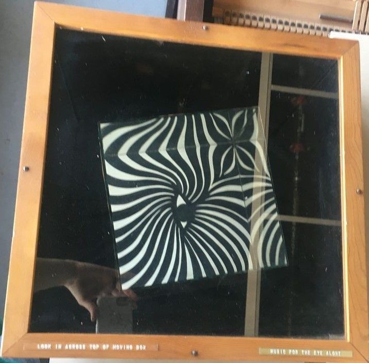 "look in across top of moving box", dark enclosure with glass piece that rotates, picture inside of an eye with waves, plug in for powerCollection