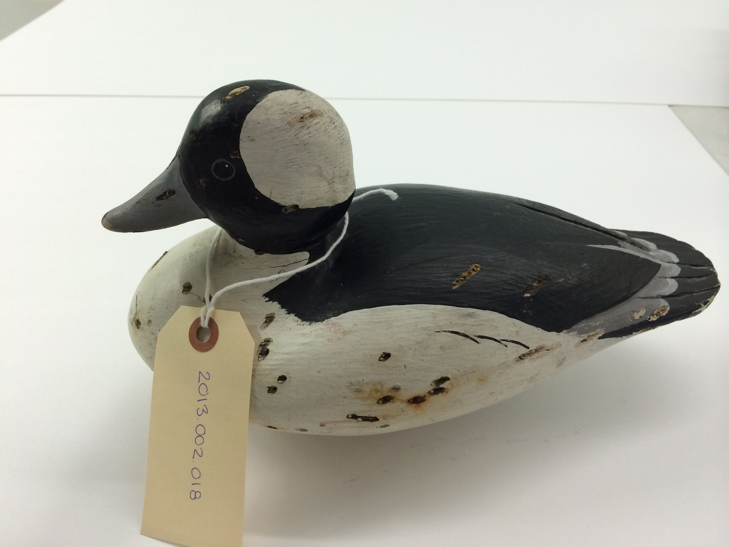 Hand carved wooden decoy of Bufflehead duck (one of a pair - second is 2013.002.019)