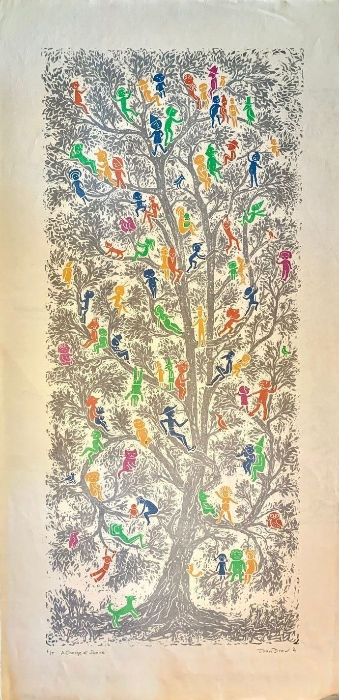 Multicolored: tree is light blue, figures ar either green, red, yellow, blue, or pink