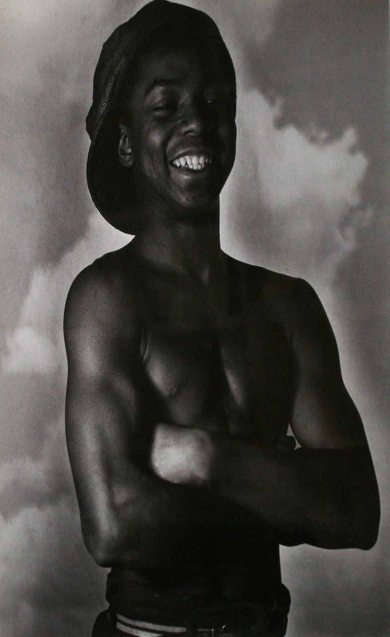Black and white portrait of a boy smiling with his arms crossed