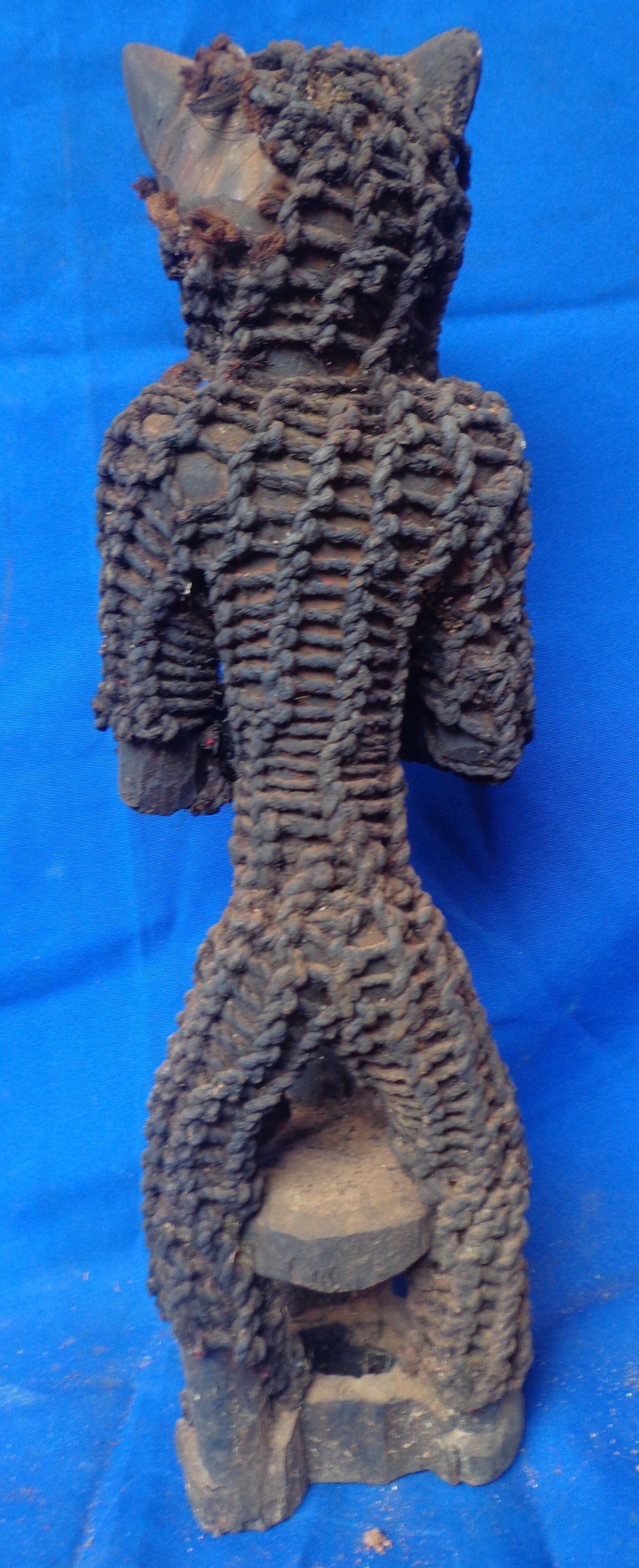 Sculpture of a man with two horns on his head, holding a long staff that is resting on a stool in front of him. The stool is decorated the carved image of a spider. The figure is wrapped in a woven fiber mesh that serves as clothing and covers the man's body and head.Context