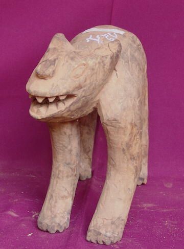 Zoomorphic sculpture of a leopard standing, facing to right, decorated with lozenge shaped spotsDimensions