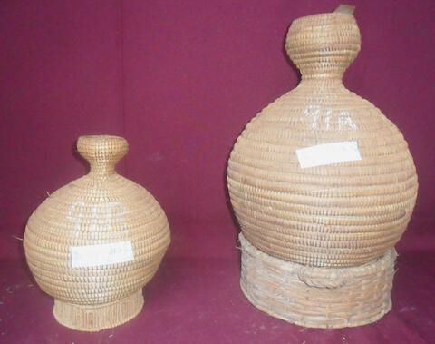 Baskets woven in the form of calabash out of elephant grass with raffia fiber bases. Round bodies with narrow necks opening up at the top.Context