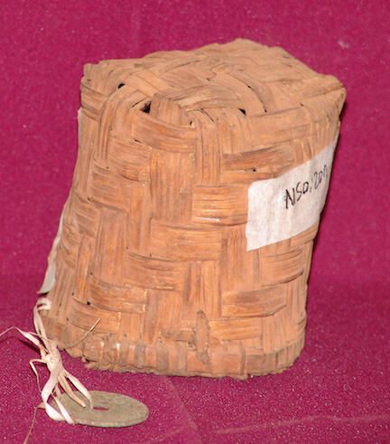 Miniature of a traditional market basket, with a coin attached. Coin engraved with a Star of David on one side, and on the other ?? one penny, ?? with bishop's hat engraving, ?? 1947, British West Africa. ??Dimensions