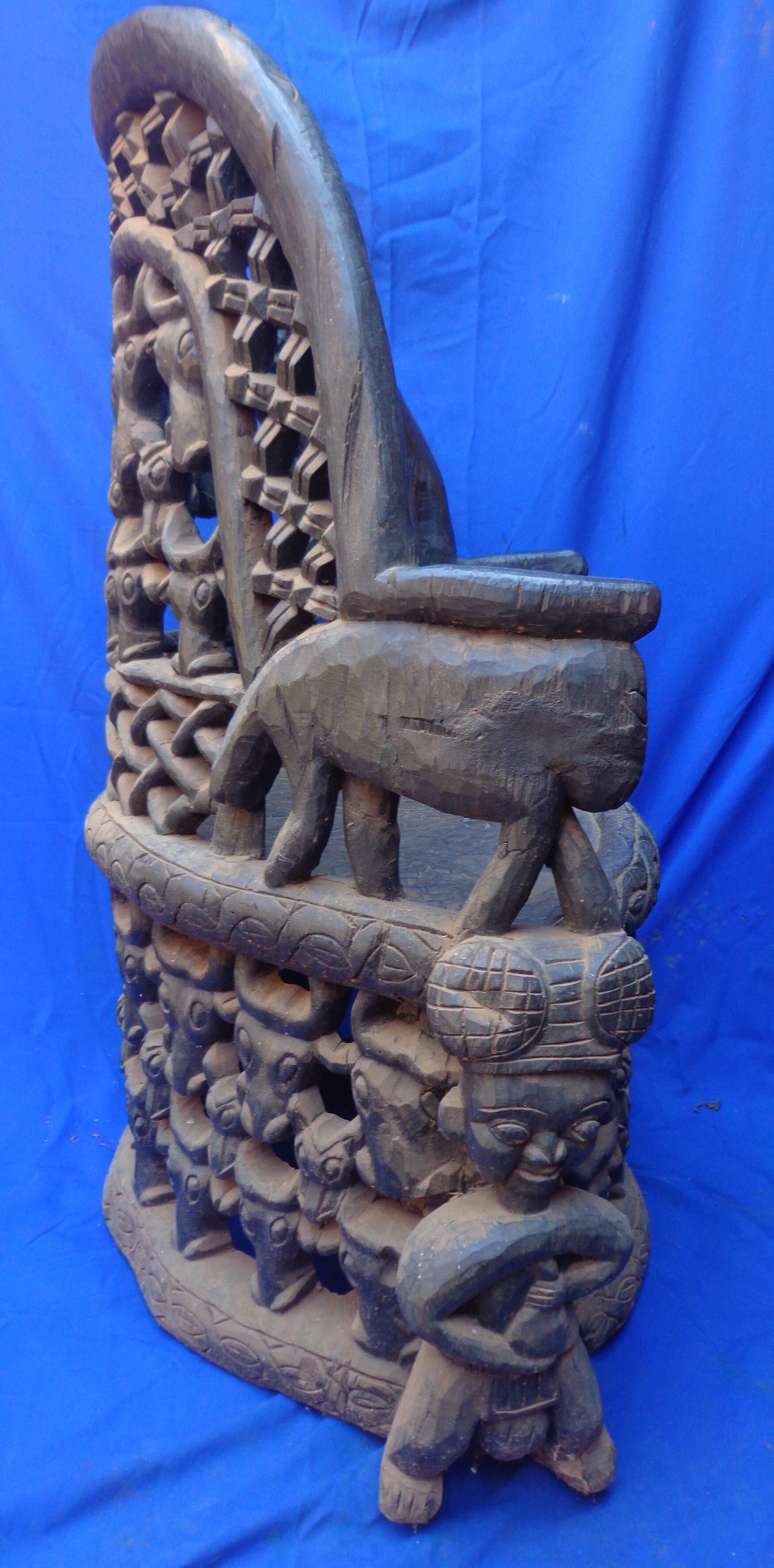 Ornately carved throne with high back and arms. Back is carved with bull's heads and interlocking open wave shapes around the edge. Arms are supported by figures of leopards. The seat is supported on the front corners by men wearing traditional caps holding palm wine cups. The base is made of carved bull's heads.Context
