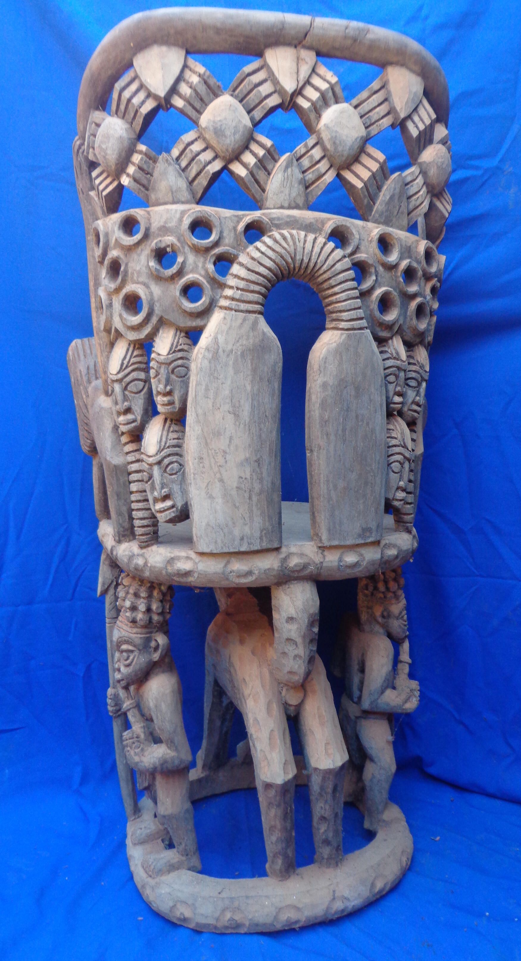 High backed throne carved with royal icons: arms are figures of lions, with their tails going up the edge of the back; seat is supported by two male figures wearing traditional caps and loin cloths, holding a staff and smoking a pipe on the sides with a leopard facing the front of the seat; the back made up of a central double gong with three carved faces on either side with circle shapes above them, topped by four spiders. Seat is edged with lozenge/cowrie shaped carving.Context