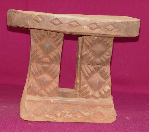 Stool like throne with eight spiders carved on its pedestal, with geometric shapes carved around the base and seat.Context
