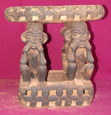 Stool with a round seat carved with cowrie shapes in star patterns around the edge. Supported by four nude male figures that are squatting with their elbows on their knees, hands on their faces. They are facing in pairs towards the front and the back of the stool. They are resting on a rectangular base that is also decorated around the sides with cowrie shapes in star pattern.Context