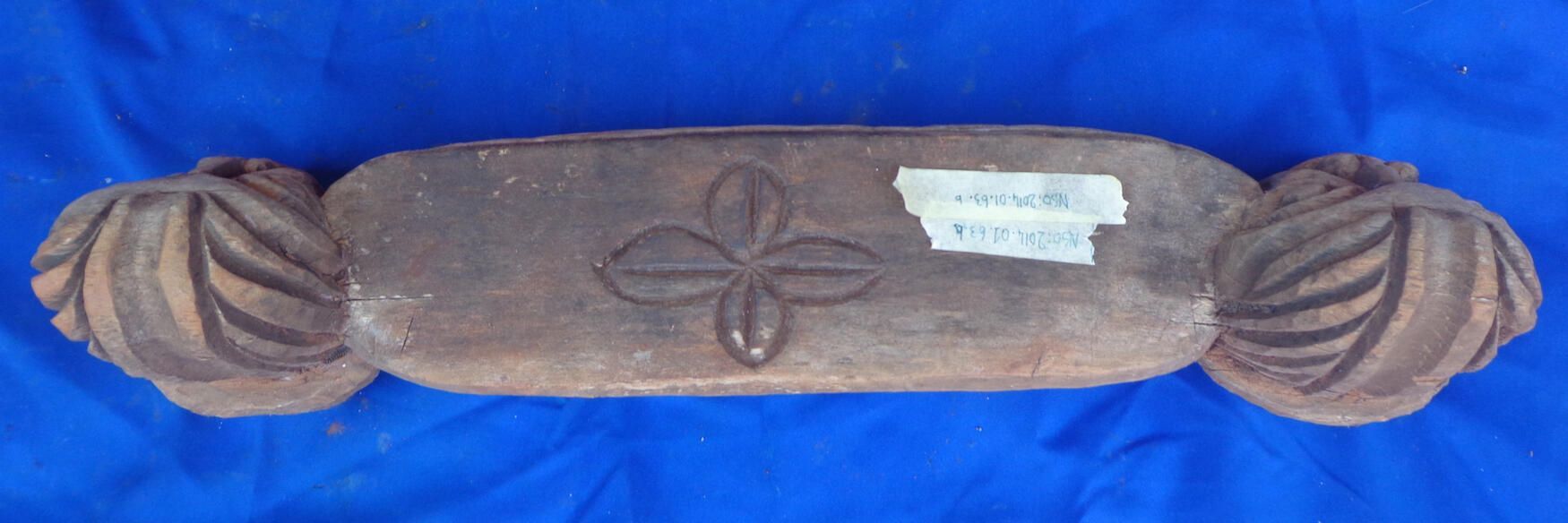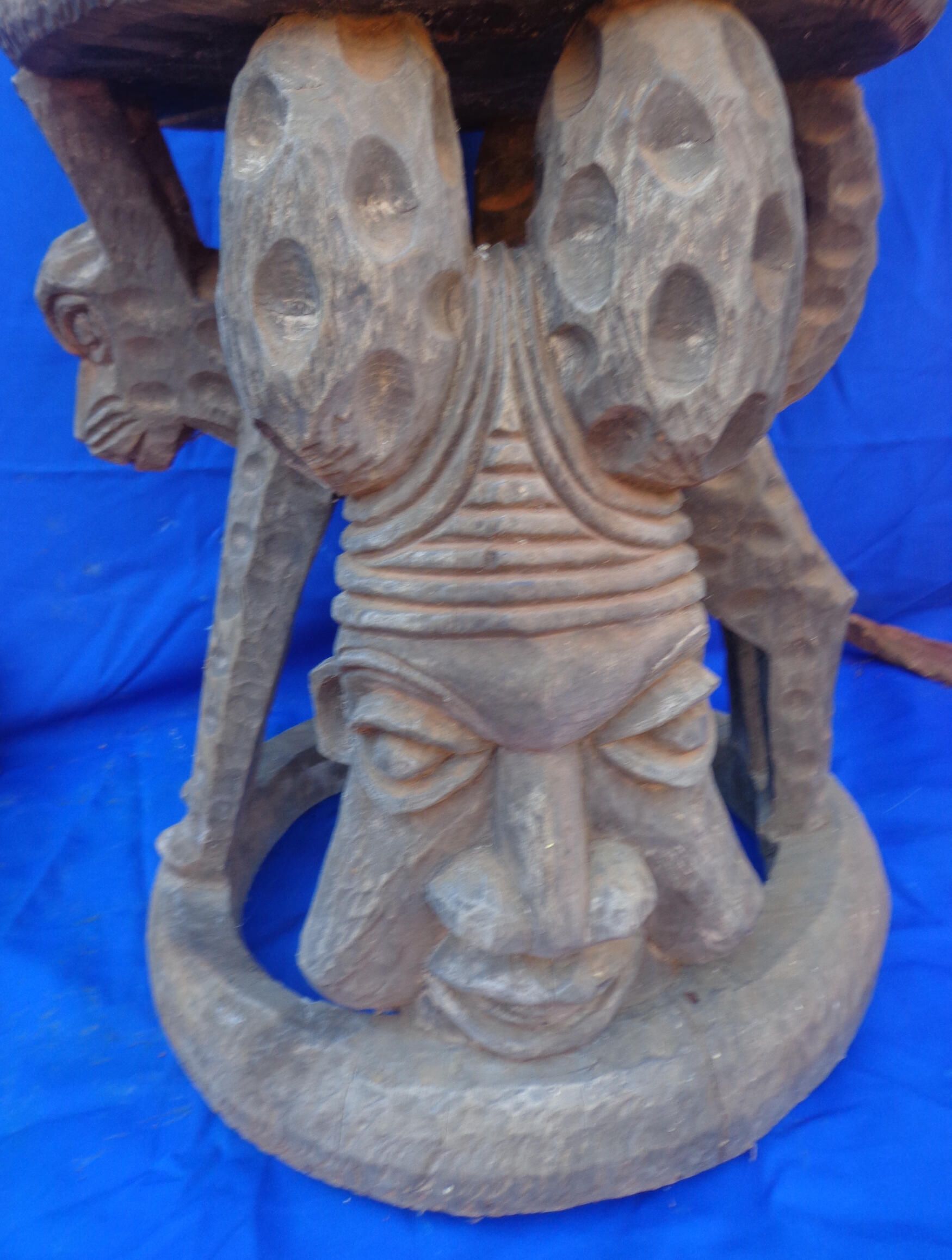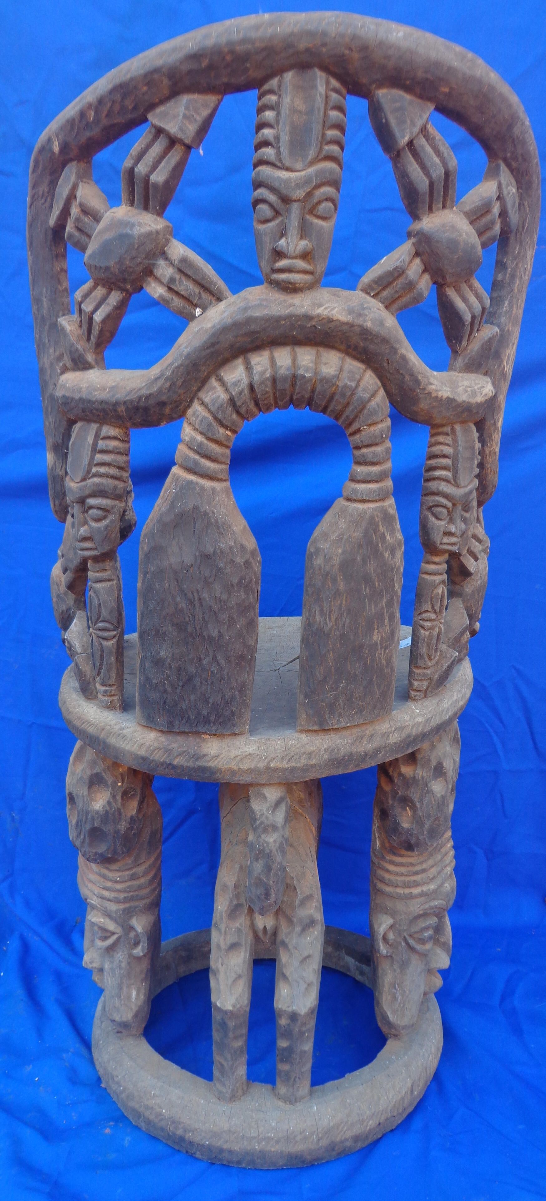 High carved back is carved with double gong at the center, on either side male heads wearing tall caps set on posts decorated with cowrie shell images. Above the gong a third head with spider images on either side. The arms are formed of carved spiders, hand rest of smiling male faces without caps set on a post decorated with cowrie images. The round seat is set upon a base supported by a central female leopard with male heads with full cheeks wearing traditional caps. The foot rest is carved with four cowrie images on top, cowries carved around the edge, and two men's heads on either end.Context