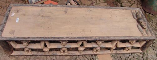 Top is an unfinished undecorated plank save for double leopard pillow. Leopards are just front half, connected in their upper bodies, facing out to either side. One long side is supported by figures of four men holding up the bed with their joined arms, with three dogs heads nose down with ears touching the men. Other sides are plain and open.Dimensions