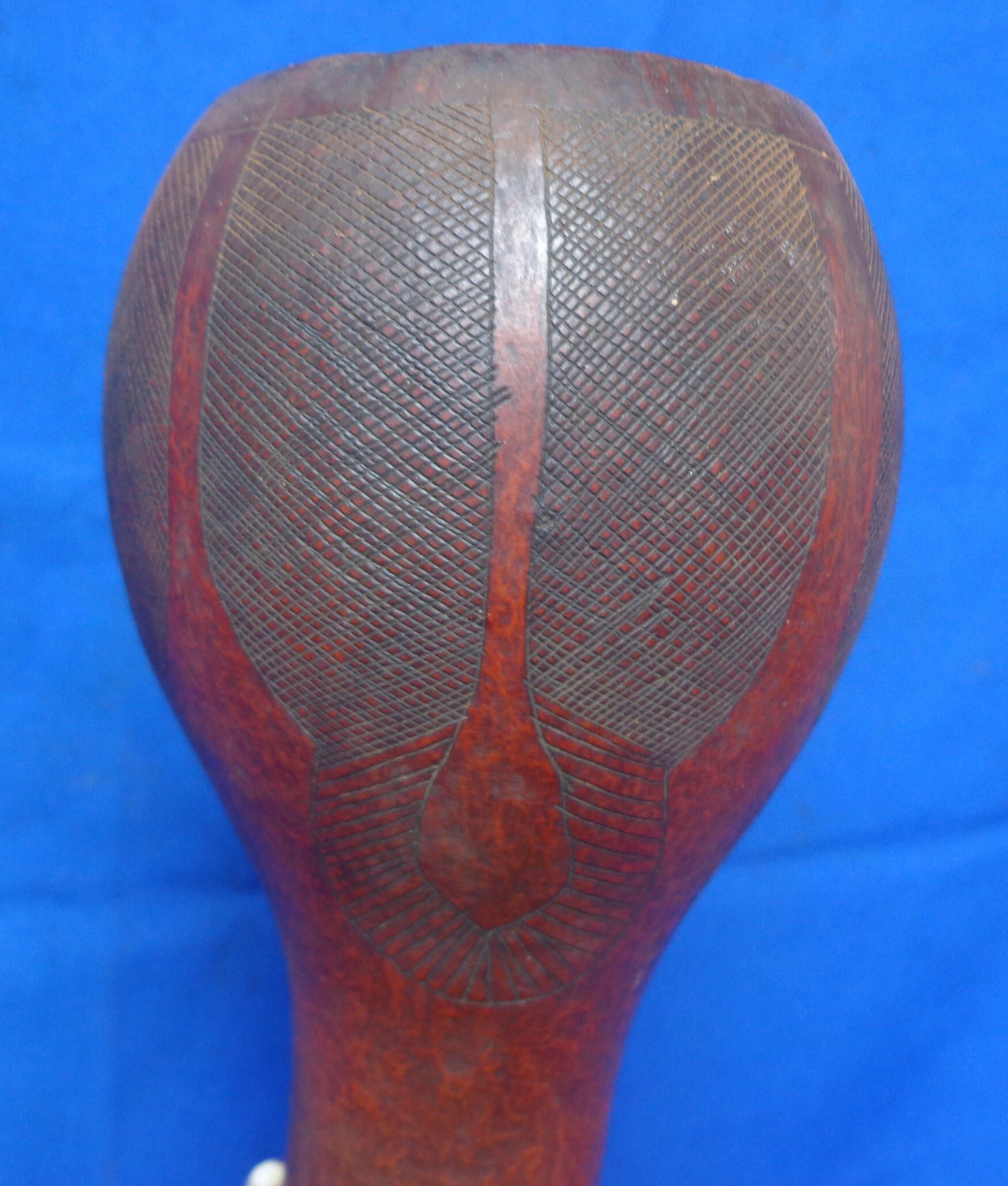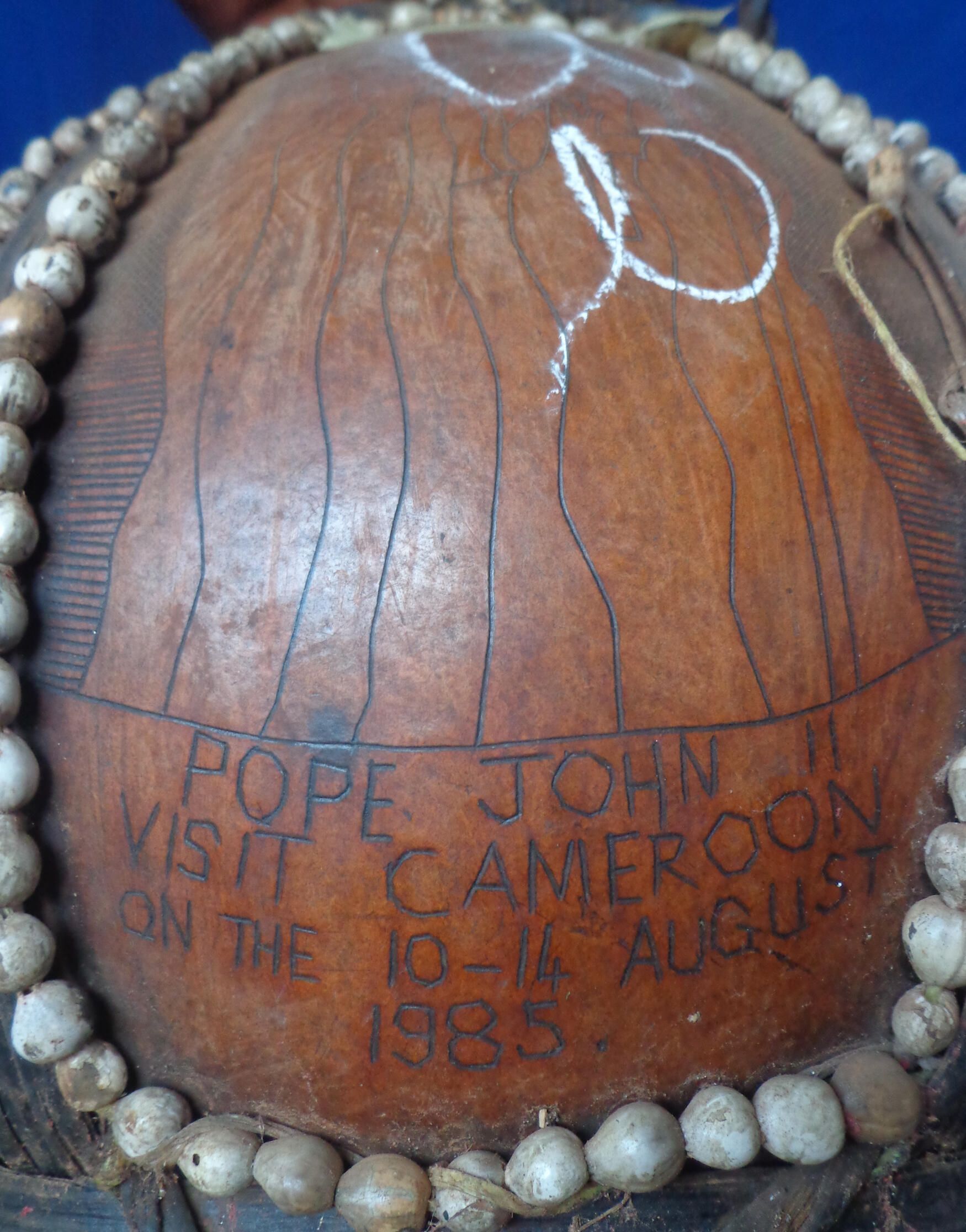 The stopper is the figure of a seated Fon wearing a traditional cap and holding a traditional palm wine cup. The mouth of the vessel is carved with double gongs. It is held in a carrier made of white wooden beads and strips of raffia which create sections around the body of the calabash which are carved with images representing events and language as follows: Pope John II's visit to Cameroon, the Messiah Christ the King, Abraham sighting the Promised Land, He brought forth the stream from the rock, Evildoers: the just ruler cutting of evildoers from the Lord's city.Context