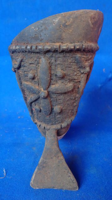 Cast iron horn shaped cup decorated with beaded lines and organic shapes. Cup sits on the point and a triangular shaped foot.Context