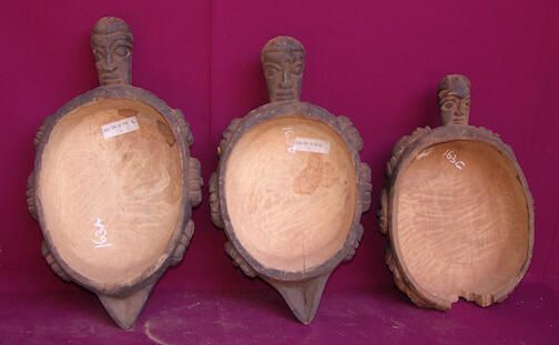 Bowls in the shape of a turtle with a tail at one end and a human head at the other. "A" has six double gongs carved around the sides of the bowl with circle shapes in between. Human head has carved hair. "B" is the same as "A". "C" has alternating double gongs and spiders carved around the sides, four spiders and two gongs. Head shows partially shaved area on top. All bowls sit on short pedestals and are blackened on the exterior, bare wood inside.Dimensions