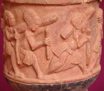 Tall narrow drum carved in four tiers. Upper tier is a parade of 7 overlapping men striding. They wear traditional caps and loin cloths and are carrying walking sticks in their right hands. Some are carrying a log on their left shoulder. Second tier painted black, bordered by a chain of open oval shapes. Third tier is made up of 8 shield shapes in pairs carved in diamond patterns on their surface. In between the double shield shapes are vertical bands carved with wavy lines. Under that tier is a band similarly carved but horizontal. Last tier is carved with four dog heads with forelegs pointing down, in between them are vertical bands carved with wavy lines and leaf shapes.Dimensions