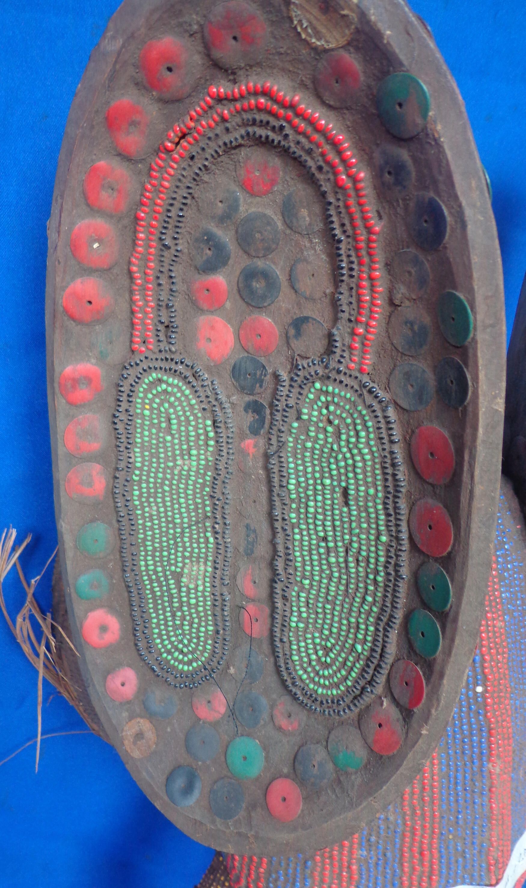 Wood, glass beads, buttons, rafia