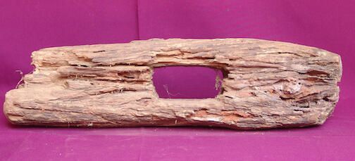 Log that has been carved with a large rectangular hole in the middle, surrounded by smaller perforationsContext