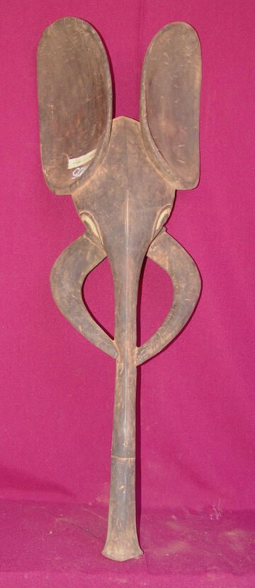 Typical horizontal elephant mask with large oval ears, long trunk, tusks that curve out, around and back to touch the trunk. Carved out eyes and teeth. Surface shows chisel marks. Forehead deliberately scarred. Painted overall with black pigment, left light around features.Dimensions