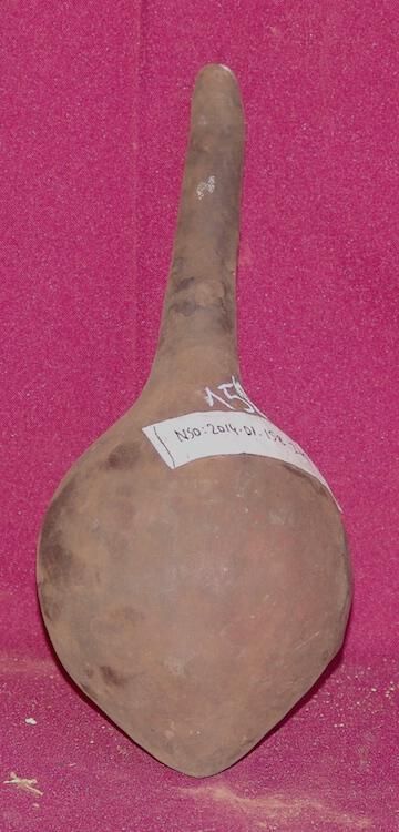 Round bellied dry calabash with a long stem with a hole at the end, filled with dried seeds that rattle when shaken.