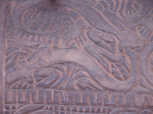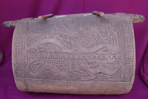 Elaborately carved, horizonal cylindrical drum. Handles are two smiling human faces. Surface carved with 12 lizards facing in alternate directions. Also two spider shapes and a plant form. In between the lizards are carved variously sized rectangular shapes, and around the edges a border of alternating vertical and horizontal lines. Ends and bottom of drum are plain. Opening is a vertical slit with larger rectangular openings at each end. Beaters are smooth rods made of bamboo.Dimensions