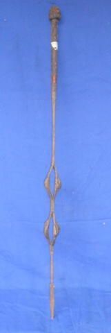 Black staff with knobbed handle decorated with carving and lozenge shaped buttons. Handle connected to shaft with copper wire. Shaft formed with two open worked areas ending in a blade shaped point.Context