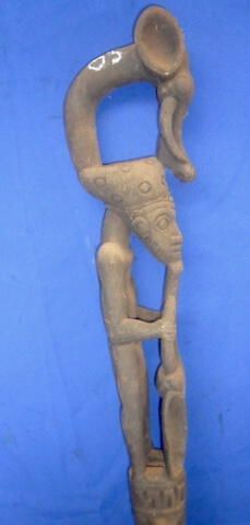 Anthropo-zoomorphic staff. Elaborately carved with three lizards, the head of an elephant, a buffalo,and three human heads. Full figure of a man holding the head of an elephantContext