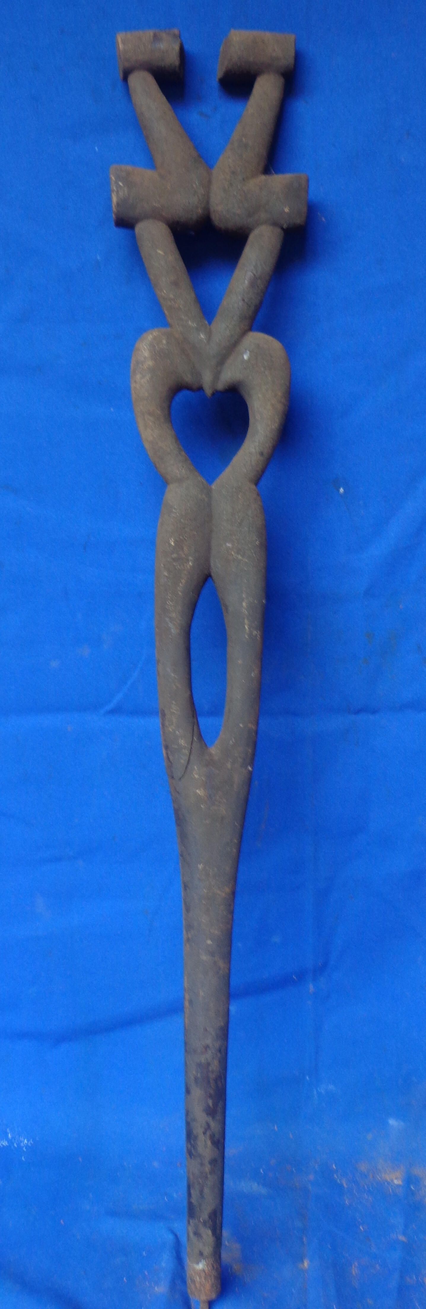 Shaft splits in two part way up and forms open oval, heart, triangle and "Z" shapes that form the handle. The initial split starts to form what appears to be two facing birds whose heads meet at the top of the heart shape. Tip is covered with aluminum.Context
