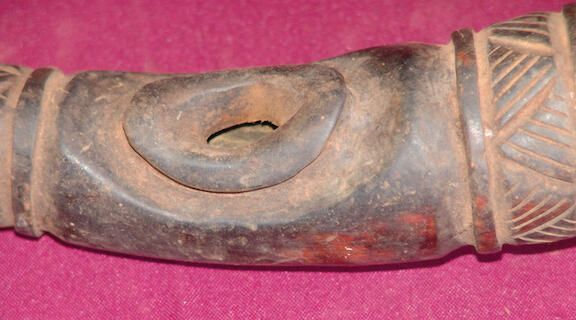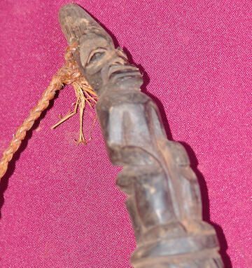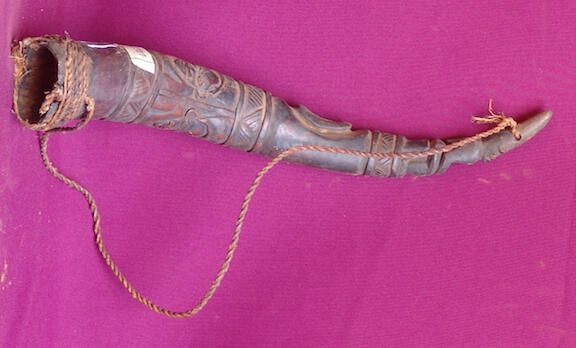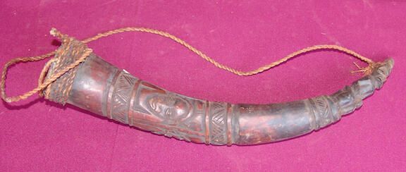 Side-blown trumpet made of a hollowed out cow's horn. Narrow end is carved with a man wearing a traditional cap sitting on a stool. The bell is carved with the heads of three men, some decoration. A braided fiber cord is attached at both ends for carrying it.Dimensions