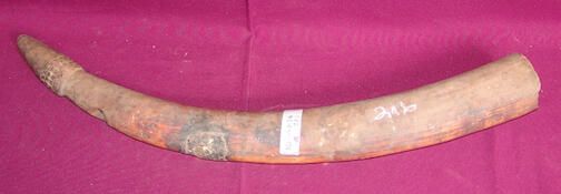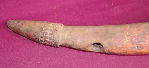 Trumpet carved from an elephant tusk. It is sounded by blowing into a large aperture carved at the narrow end, above which is encircled with a band of geometric carving.Context