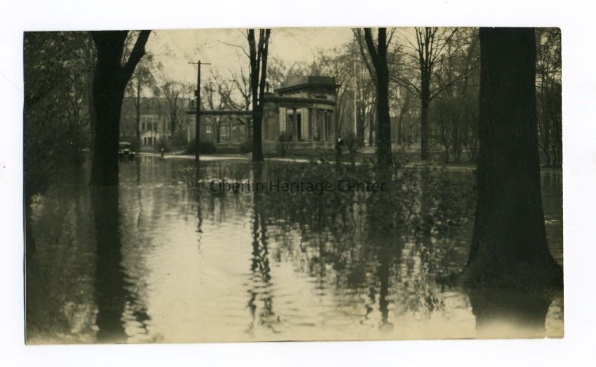 One black and white photographic print of the March 1913 Oberlin Flood. The water covers Tappan Square and Professor Street. The Memorial Arch and the Carnegie Library building are visible in the image.Photograph Details