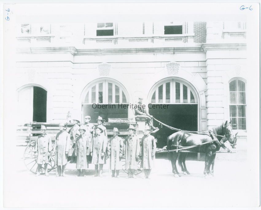 One black and white photograph of 10 men in fire fighting uniforms posing in front of a horse drawn fire wagon. The driver of the wagon is another man wearing a suit. Two horses are leading the fire wagon. None of the men are are identified. They are photographed in front of Old Town HallPhotograph Details
