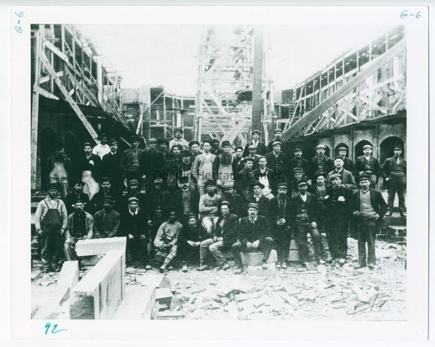 Black and white photograph of a diverse group of construction or railroad workers. Almost all of the men wear some kind of cap, overcoat, boots, or overalls. They pose in front of the wood frame and scaffolding of an incomplete building, with some sitting or standing on stone blocks.Acquisition
