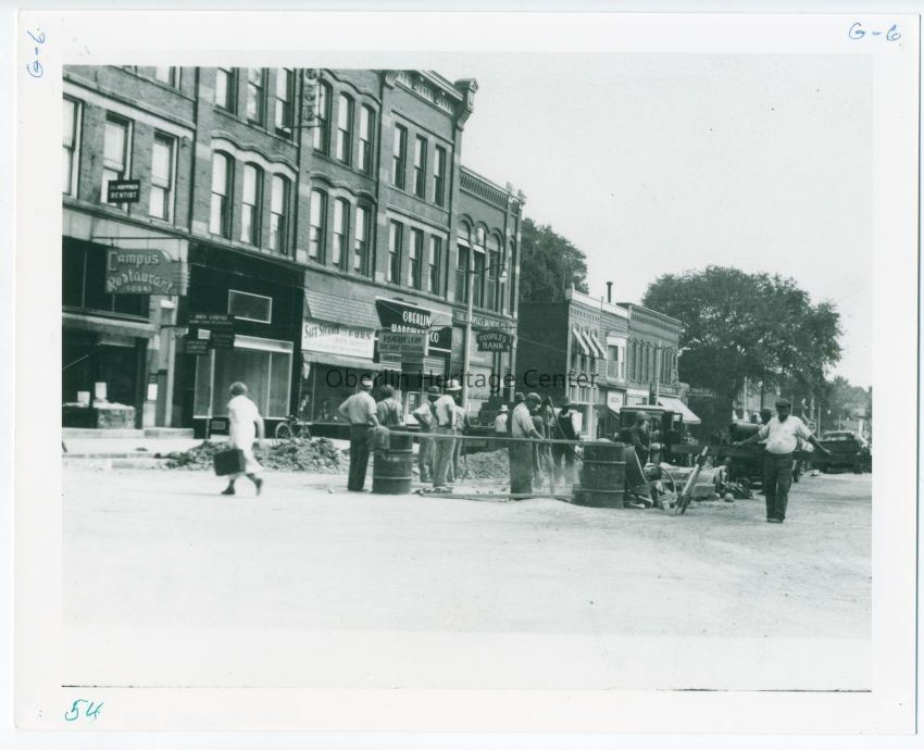 Black and white photograph of a group of men working on construction outside of businesses in Oberlin on S. Main Street. The Campus Restaurant, Robinson Dry Cleaning, Oberlin Hardware Co., The People's Bank, and a grocery store are featured in the background. Most of the men wear caps and white shirts. A woman wearing a white dress and holding a briefcase walks across the street in front of the men.Photograph Details