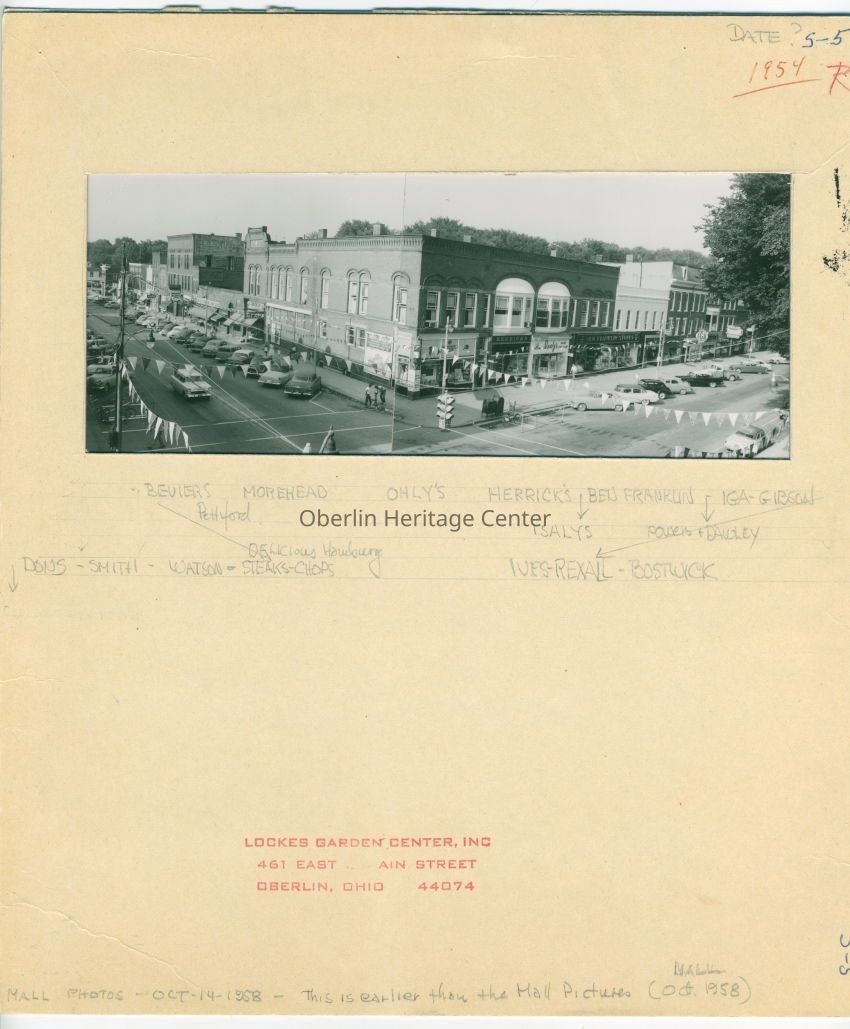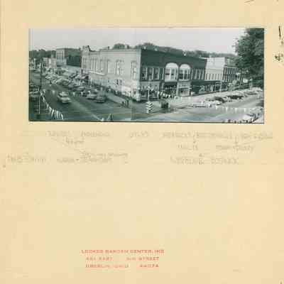 Black and white photograph of downtown Oberlin. This panoramic image was created by stitching two photographs together. The intersection of College and Main St is decorated with pennants and there are many cars parked on the street. A hand written note at the bottom lists business visible in the picture including: Beviers, Steaks & Chops, Morehead, Ohly's, Herrick's, Isaly's, Ben Franklin, Powers and Dawley, IGA, Gibson's, Ives, Rexall, Bostwick, Dons, Smith, Watson's.Photograph Details